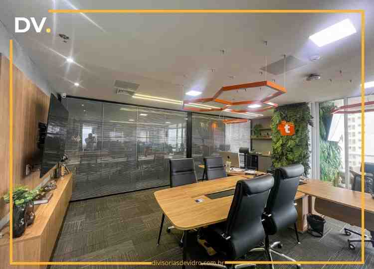 A divisória de vidro com persiana automatizada em Alphaville via Alexa, representa o ápice da tecnologia e funcionalidade no design de interiores. Através de um ambiente corporativo moderno, essa solução une a sofisticação estética do vidro com o controle total de privacidade e luminosidade por comando de voz.