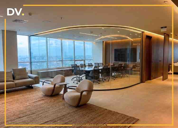 Temos o melhor preço por m2 de divisórias de vidro curvo com projeto personalizado e várias formas de pagamento facilitado, inclusive por BNDES.